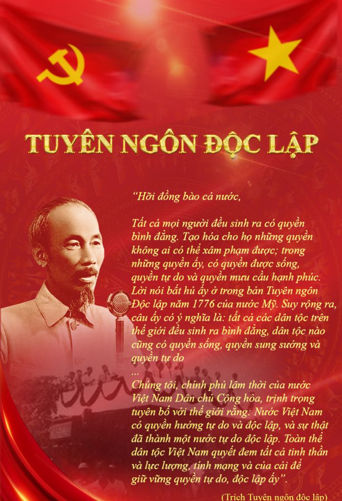 TUYÊN NGÔN ĐỘC LẬP “Hỡi đồng bào cả nước, Tất cả mọi người đều sinh ra có quyền bình đẳng. Tạo hóa cho họ những quyền không ai có thể xâm phạm được; trong những quyền ấy, có quyền được sống, quyền tự do và quyền mưu cầu hạnh phúc. Lời bất hủ ấy ở trong bản Tuyên ngôn Độc lập năm 1776 của nước Mỹ.