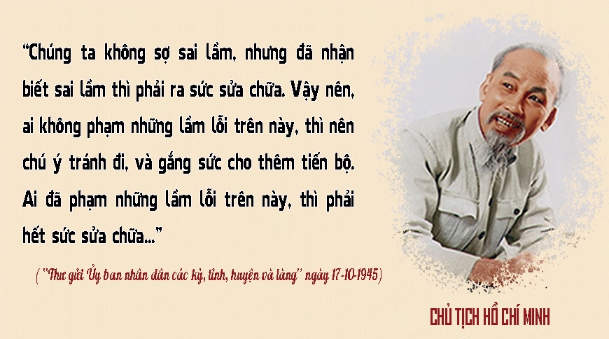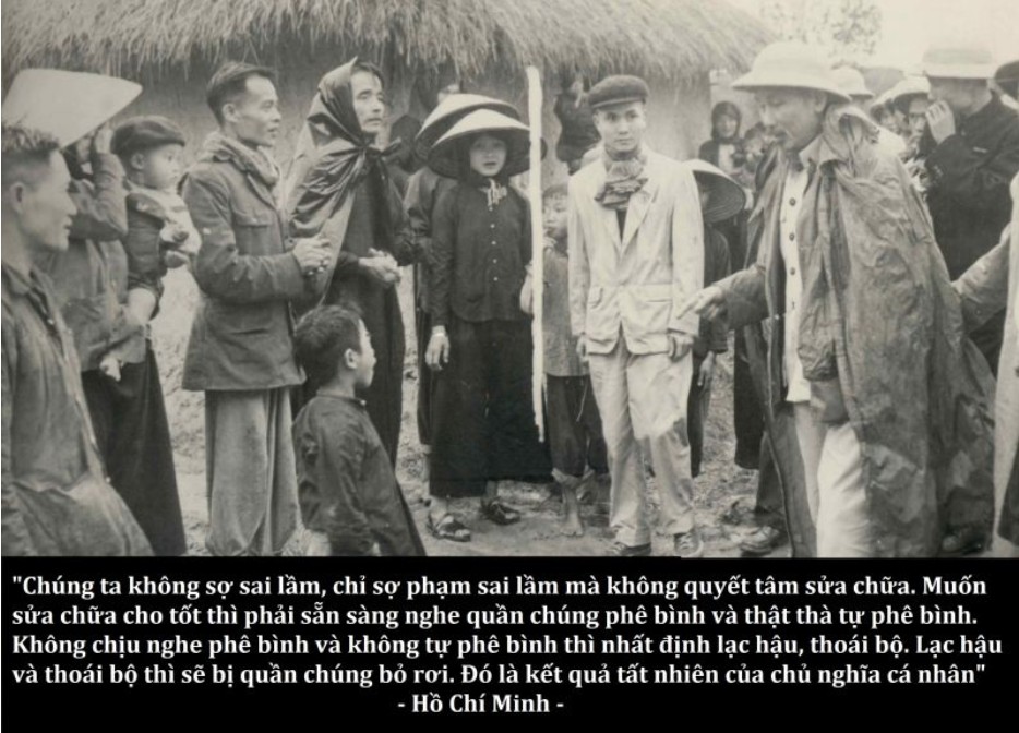 Chúng ta không sợ sai lầm, chỉ sợ phạm sai lầm mà không quyết tâm sửa chữa. Muốn sửa chữa cho tốt thì phải sẵn sàng nghe quần chúng phê bình và thật thà tự phê bình. Không chịu nghe phê bình và không tự phê bình thì nhất định lạc hậu, thoái bộ. Lạc hậu và thoái bộ thì sẽ bị quần chúng bỏ rơi.
