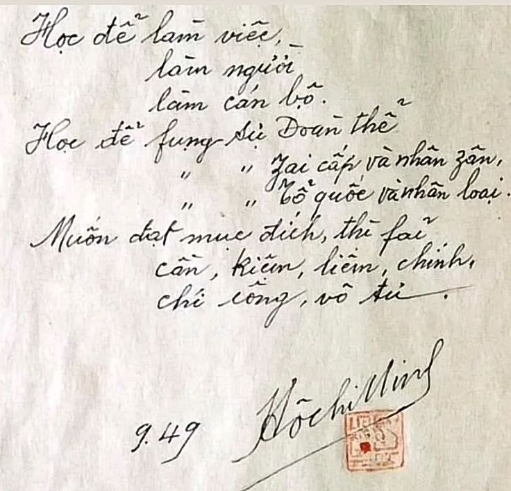 Học để làm việc, làm người, làm cán bộ. Học để phụng sự Đoàn thể,phụng sự giai cấp và nhân dân, phụng sự Tổ quốc và nhân loại. Muốn đạt mục đích, thì phải cần, kiệm, liêm, chính, chí công, vô tư.