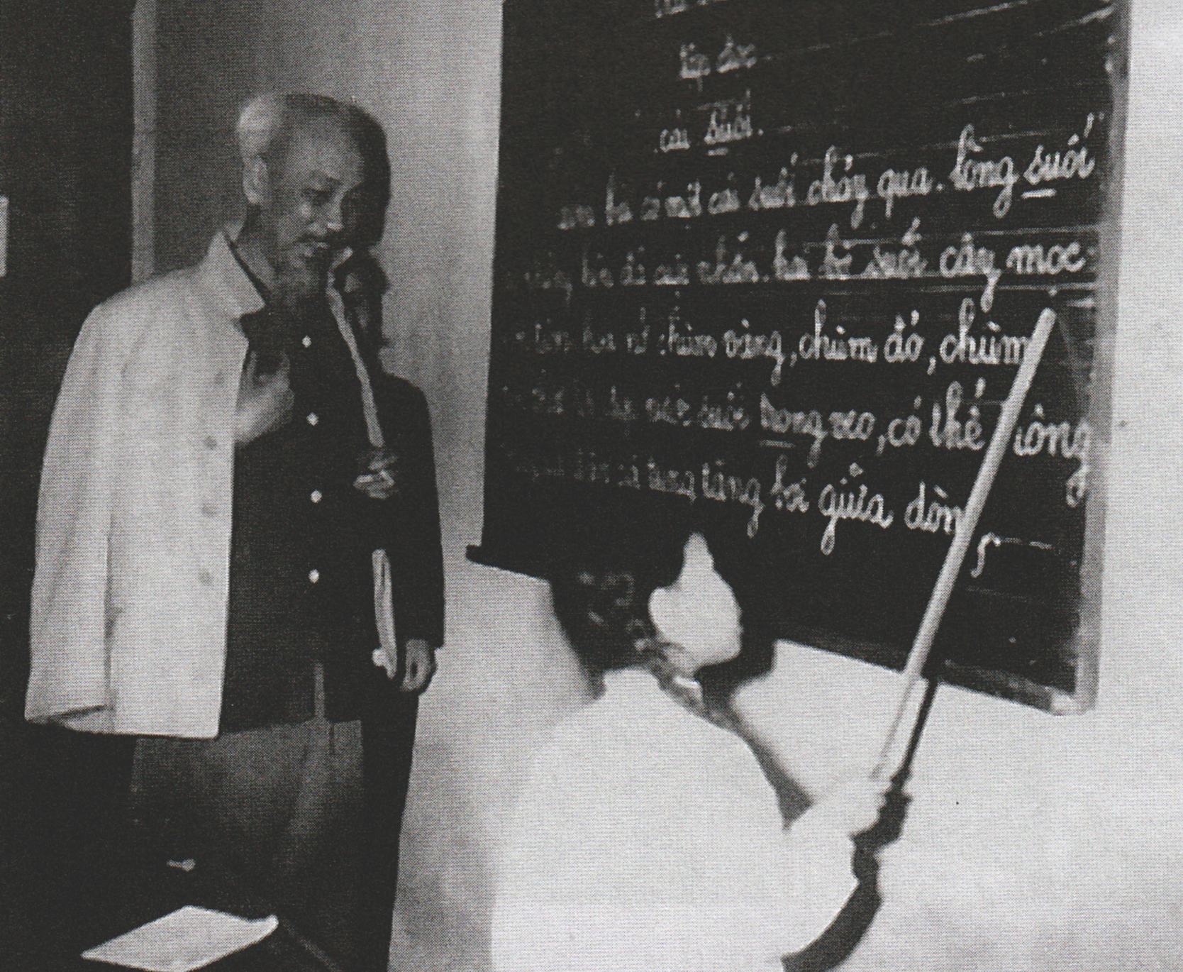 Chủ tịch Hồ Chí Minh xem một cháu bé Trường Mầm non Sao Sáng, Hà Nội đọc vần ngày 27/4/1962.