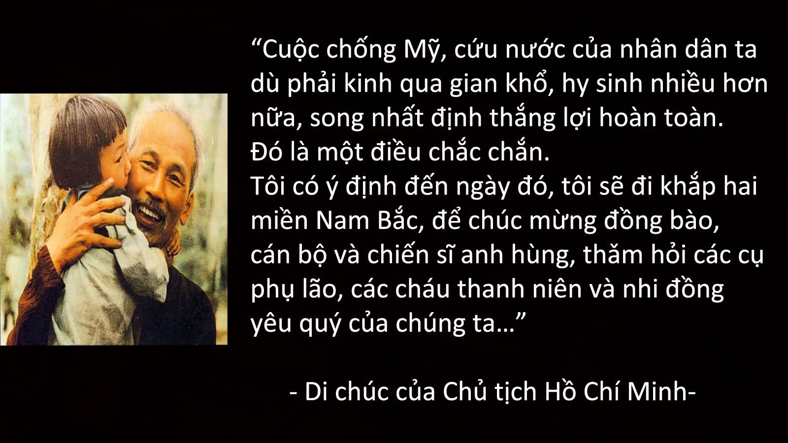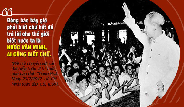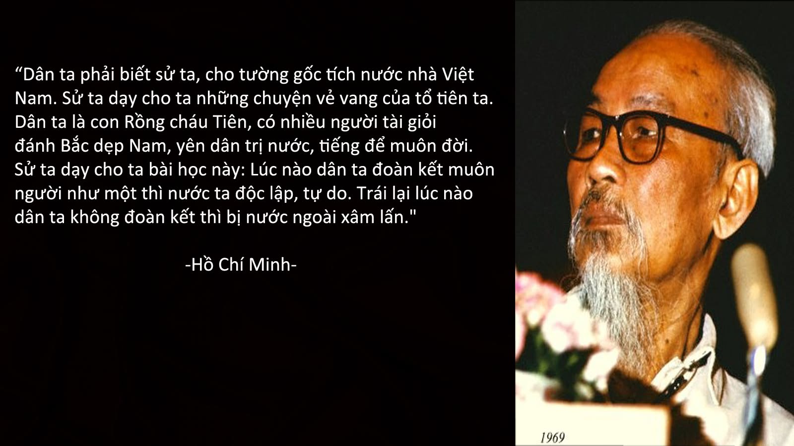 Dân ta phải biết sử ta, cho tường gốc tích nước nhà Việt Nam. Sử ta dạy cho ta những chuyện vẻ vang của tổ tiên ta. Dân tộc ta là con Rồng cháu Tiên, có nhiều người tài giỏi đánh Bắc dẹp Nam, yên dân trị nước, tiếng để muôn đời. Sử ta dạy cho ta bài học này: Lúc nào dân ta đoàn kết muôn người như mộ